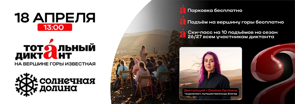 Горнолыжный комплекс «Солнечная долина» выступает площадкой для проведения открытого диктанта. Мероприятие пройдет на уникальной высоте — в кафе «Вершина», расположенном на горе «Известная». 18 апреля в 13:00.