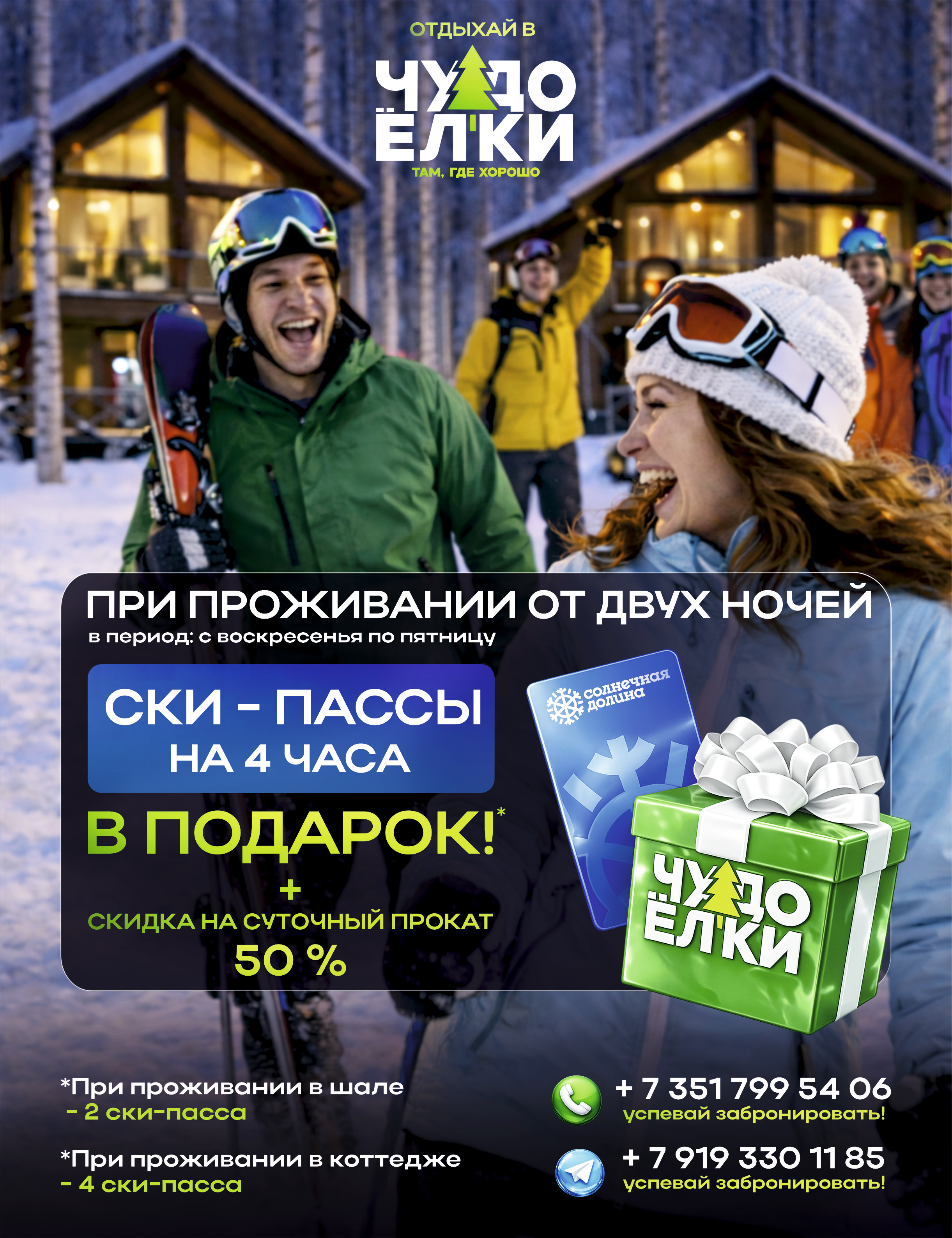-при проживании от 2-х ночей в период с воскресенья по пятницу ски-пасс на 4 в подарок + 50% скидки на прокат
