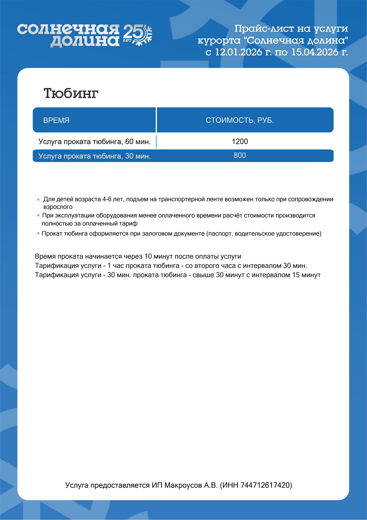 *(Дети от 4 до 6 лет, с сопровождением родителей (или законных представителей) на ленточном подъемнике. Дети до 14 лет допускаются при письменном согласии от родителей (или законных представителей). Общие требования -  вес не более 80 кг. Рост не более 180 см. Катание вдвоем на одном тюбинге запрещено.